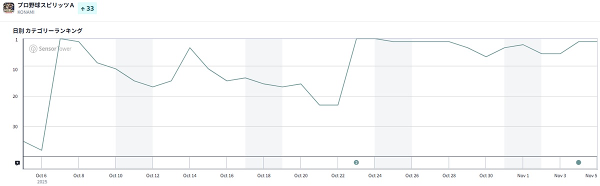前日6位から2位に浮上したのは、コナミデジタルエンタテインメントの『プロ野球スピリッツA』だ。