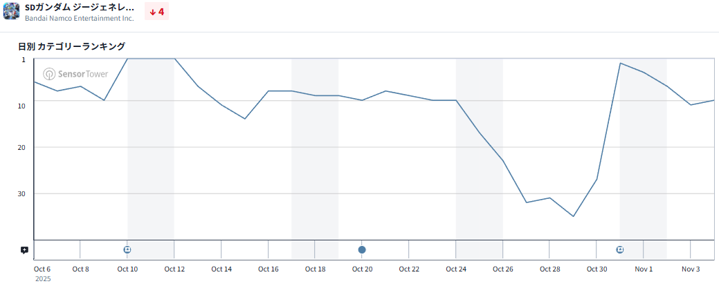 このほか、バンダイナムコエンターテインメント『SDガンダム ジージェネレーション エターナル』が11位にランクアップ。こちらは10月31日には2位まで順位を上げた。こちらはメインステージ「機動戦士ガンダム 鉄血のオルフェンズ 後半」を追加するとともに、ピックアップガシャにUR「ガンダム・バルバトスルプスレクス(EX)」/UR「三日月・オーガス」などを追加している。