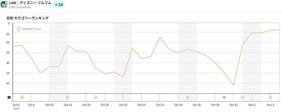 大きく順位を上げたところを見ると、LINEヤフー『 LINE:ディズニー ツムツム』が54ランクアップの8位と大きく順位を上げた。月初よりディズニー公式TCG「 ディズニー・ロルカナ・TCG」をモチーフにした新ツム「ロルカナ オーロラ〈変身〉」「ロルカナ ティンカー・ベル〈変身〉」「ロルカナ ミッキー」を追加しており、売上を伸ばした模様だ。