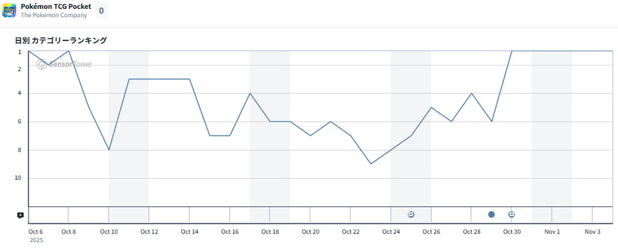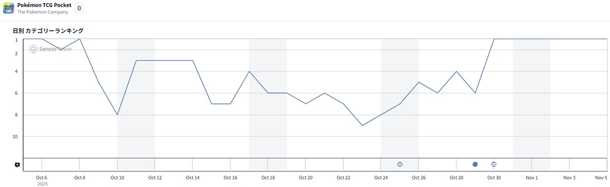 11月5日9時現在のApp Storeセールスランキング(ゲームカテゴリー)は、ディー・エヌ・エー(DeNA)<2432>は、ポケモン、クリーチャーズと共同開発したアプリ『Pokémon Trading Card Game Pocket(ポケポケ)』が首位をキープした。