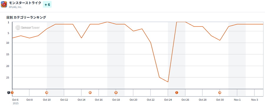 MIXI<2121>『モンスターストライク』も2位にランクアップ。「鬼滅の刃」とのコラボが本日で終了するが、この間、ガチャイベント「破界に響く星歌」や新イベント「ブレイブ・ガールズ2 ~果敢なる女傑たち~」、「もう1回!期間限定!12周年記念パック」などを開催し連休中も盛り上がっていたようだ。