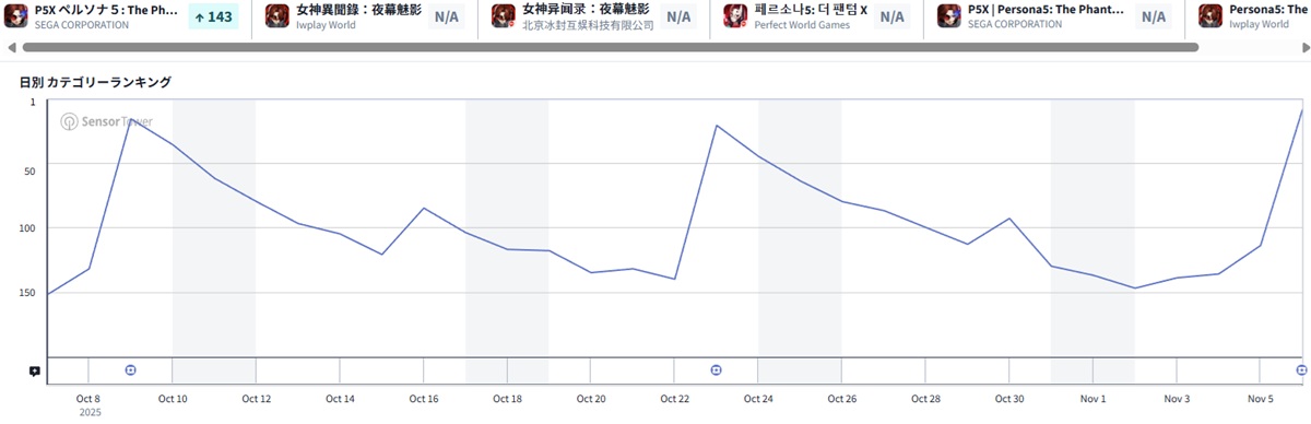 セガの『ペルソナ5: The Phantom X』が105ランクアップでトップ10圏内に入った。