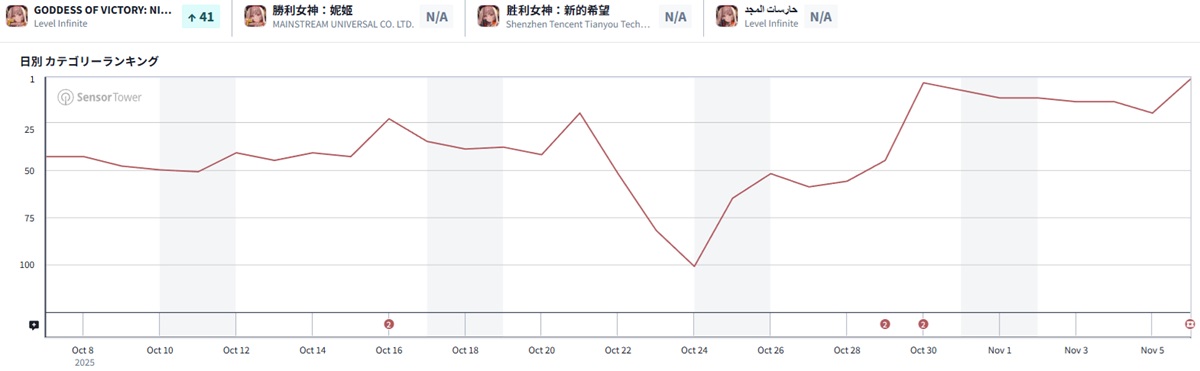 | 20 | 14 | ↓6 | 勝利の女神:NIKKE | Level Infinite |