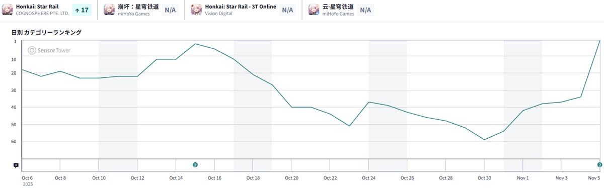 11月6日9時現在のApp Storeセールスランキング(ゲームカテゴリー)は、HoYoverseの『崩壊:スターレイル』が33ランクアップで首位に立った。