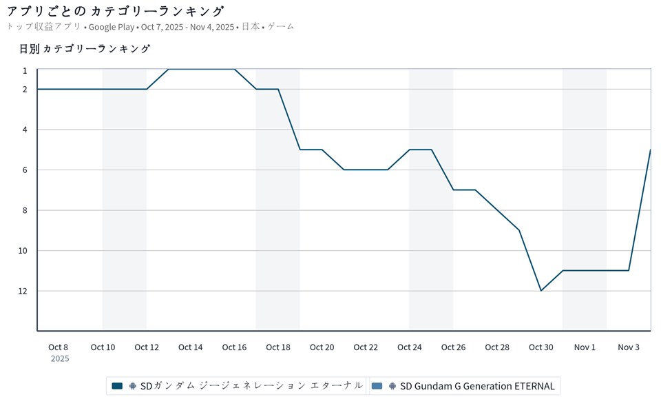 また、バンダイナムコエンターテインメントの『SDガンダム ジージェネレーション エターナル』が前日の11位から5位に上昇してきた。『ジージェネエターナル』は、10月31日にメインステージ「機動戦士ガンダム 鉄血のオルフェンズ 後半」を追加するとともに、UR「ガンダム・バルバトスルプスレクス(EX)」/UR「三日月・オーガス」とUR「ガンダム・エアリアル改修型(EX)」/UR「スレッタ・マーキュリー」が登用したピックアップガシャを開催していることが今回の順位上昇につながったもよう。