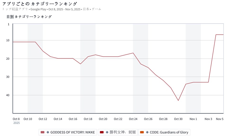 前日に大きく順位を上げていたのが、本日7位のLevel Infiniteの『勝利の女神:NIKKE』だ。『NIKKE』は、10月30日に最新バージョン「GODDESS FALL」へのアップデートを実施しており、新SSRニケ「ナユタ」(CV:川澄綾子)が登場していることなどが売上に寄与しているようだ。