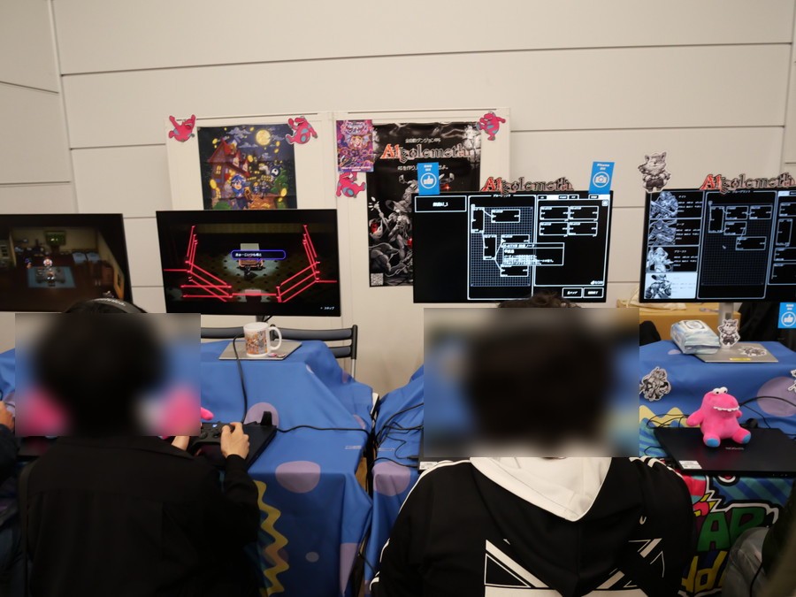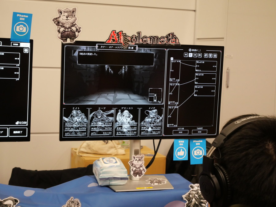 バンダイナムコスタジオのインディーゲームレーベル『GYAAR Studio』も印象的だった。出展タイトル『Algolemeth』は、ゴーレムの行動をビジュアルプログラミングで制御し、全自動でダンジョンを攻略するRPG。プログラミング思考が求められるもので、モノクロの画面かつウィザードリィライクなビジュアルも相まって2026年のリリースが楽しみである。