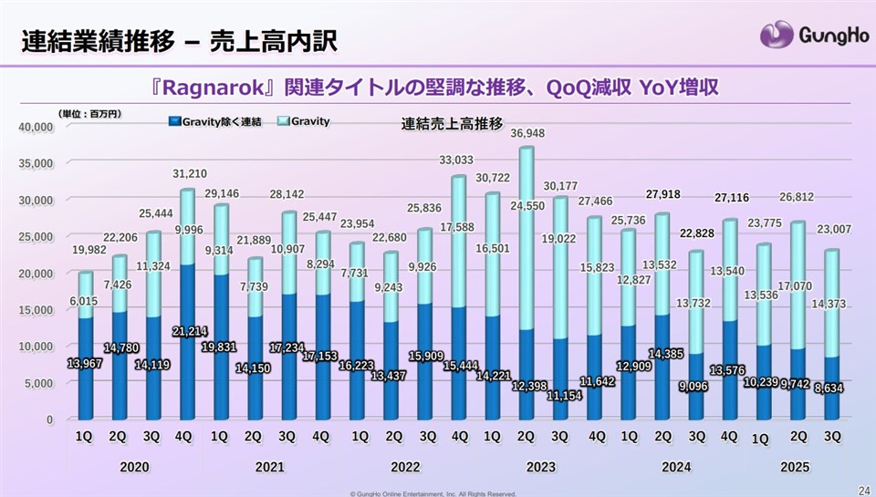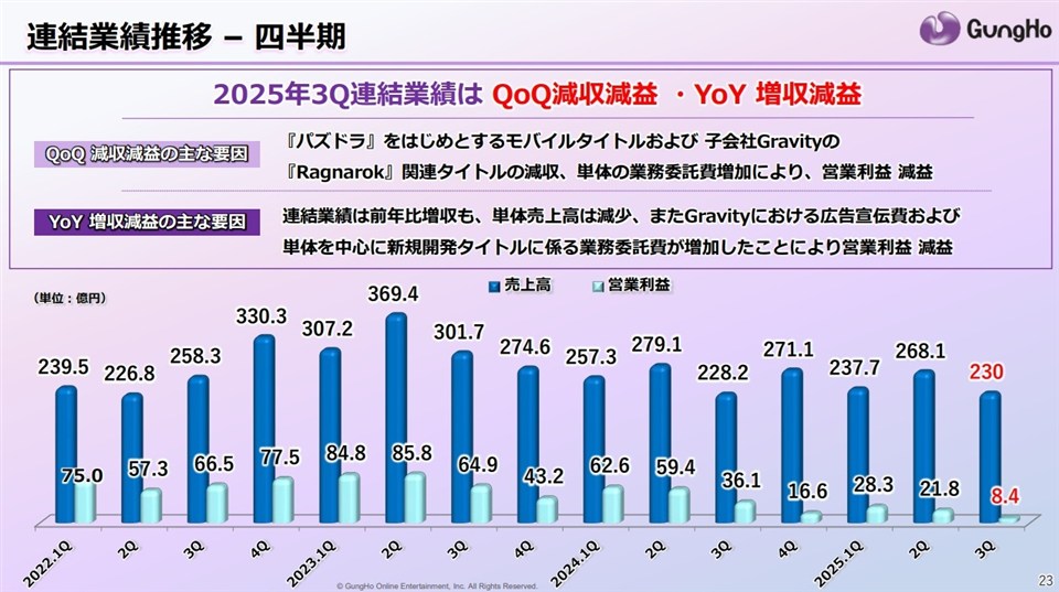 四半期推移(QonQ)での減収減益の主な要因は、『パズドラ』をはじめとするモバイルタイトルと、子会社Gravityが展開する『Ragnarok』関連タイトルのが減収となったことに加え、ガンホーにおいて業務委託費が増加したことが影響した。