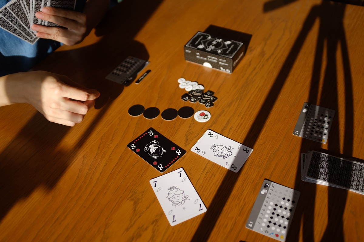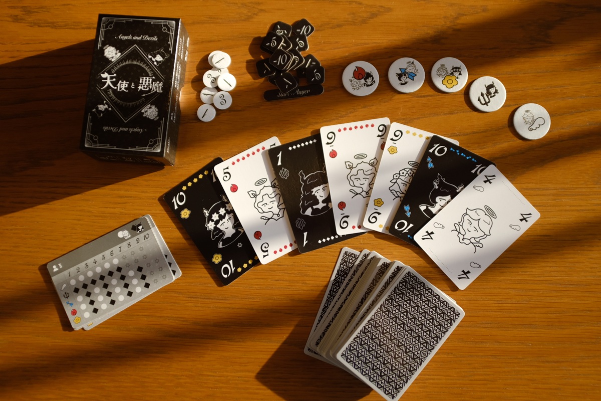 「天使と悪魔」は、1人1枚ずつカードを出しあって強さを比べるミニゲームを繰り返す、「トリックテイキング」カードゲームです。ルールはとってもシンプル。「悪魔カード」を相手に押し付けて、自分のライフを守り抜くだけ! タイミング良く「天使カード」を集められれば、ライフが回復することも。あなたは天使を味方につけられるか?