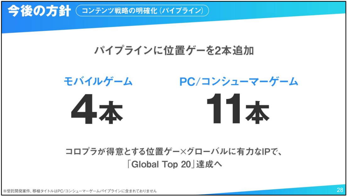 コロプラ<3668>は、2025年9月通期の決算説明資料の「パイプライン」に追加した「位置ゲー」(位置情報を使ったモバイルゲーム)2本の業績貢献時期について、「まだ開発を始めた段階である」とし、中期目線での貢献になるとの見方を示した。11月7日に開催したオンラインの決算説明会で寄せられた質問に経営陣が回答した。