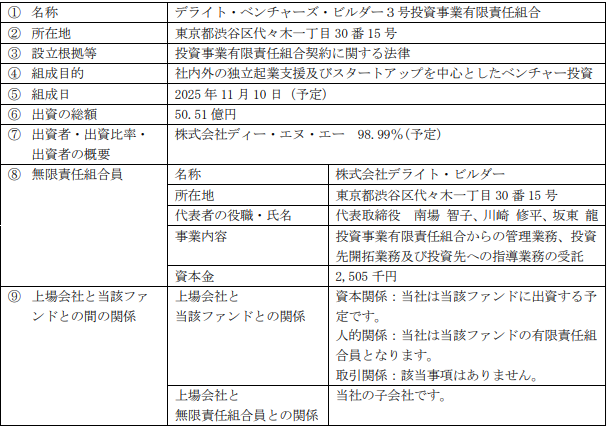 ディー・エヌ・エー(DeNA)<2432>は、この日(11月10日)、社内外の独立起業支援及びスタートアップを中心としたベンチャー投資を行う「デライト・ベンチャーズ・ビルダー3号投資事業有限責任組合」を設立すると発表した。DeNAが98.99%を出資する予定で、出資総額は50億5100万円となる。