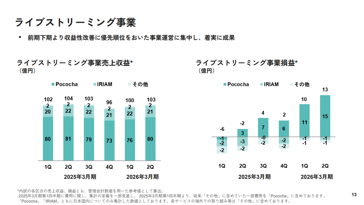 「IRIAM」については、長期のユーザーの継続率が良好に推移しており、四半期平均のDAU(日次アクティブユーザー数)も過去最高を更新した。月次課金ユーザー数も安定的に推移しており、引き続きコミュニティの健全化を維持・向上してくことで早期の黒字化を目指していく考え。