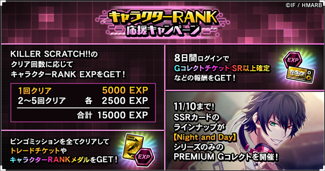 期間中、キャラクターRANK EXPを各キャラクター最大15,000獲得できるキャラクターミッションをはじめ、ビンゴミッションやログインボーナスを開催している。期間中、8日間ログインで「Gコレクトチケット:SR以上確定」などの報酬を入手できる。