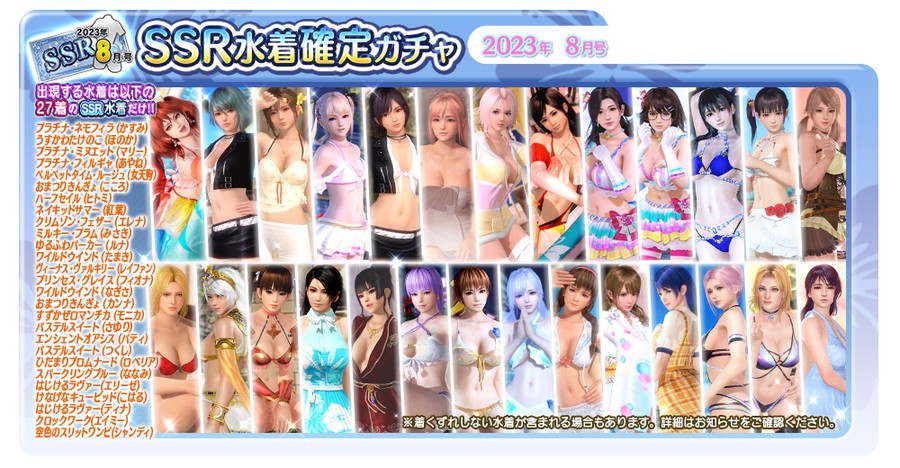 コーエーテクモゲームスは、『DEAD OR ALIVE Xtreme Venus Vacation』において、「もうすぐ8周年!オーナー様応援キャンペーン」を11月10日より開始した。本キャンペーンでは、期間中にログインすることで最大7着のSSR水着を無料で入手できる「SSR確定ガチャチケット」が毎日1枚手に入る。また、同日より「トレンドコーデガチャ」も開始され、SSR水着「めざましパーカー」に新たな女の子としてマリー、あやね、たまきが登場する。