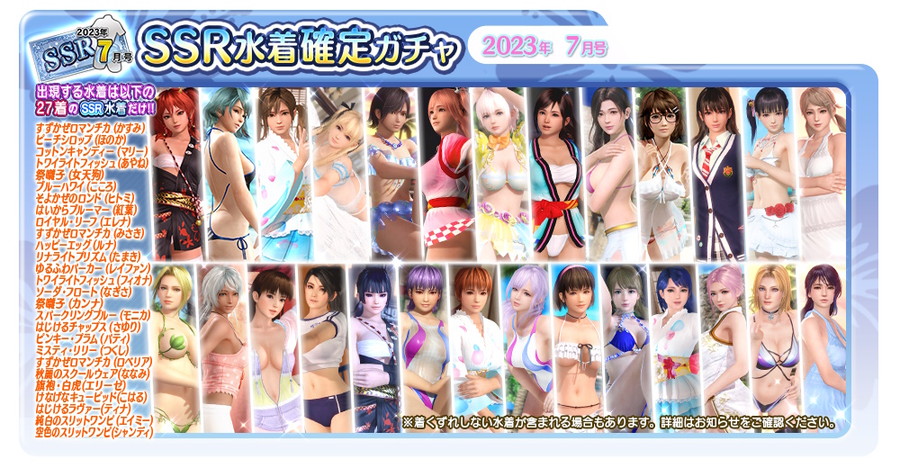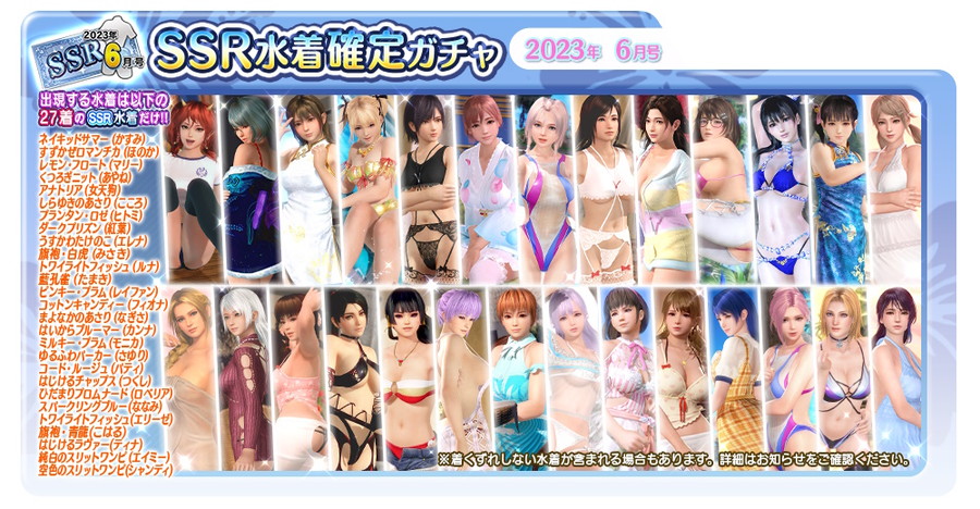 「トレンドコーデガチャ」も11月10日メンテナンス後から11月17日9:59まで開催される。登場するSSR水着は「めざましパーカー」のみで、マリー、あやね、たまきの水着が登場する。10連ガチャのステップ3/3では、SSR水着の出現確率が3.3%となる。
