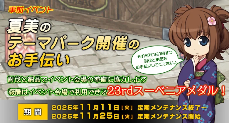 そこで『ラグナロクオンライン』では、2025年11月11日(火)定期メンテナンス終了から2週間、事前イベント「夏美のテーマパーク開催のお手伝い」をスタート。1日1回討伐クエストと納品クエストを行い、イベント会場準備のお手伝いをしよう。依頼を達成すればそのお礼としてBase&JobEXP、アニバーサリーイベント開始時にイベント会場で利用可能な「23rdスーベニアメダル」を受け取ることができる。