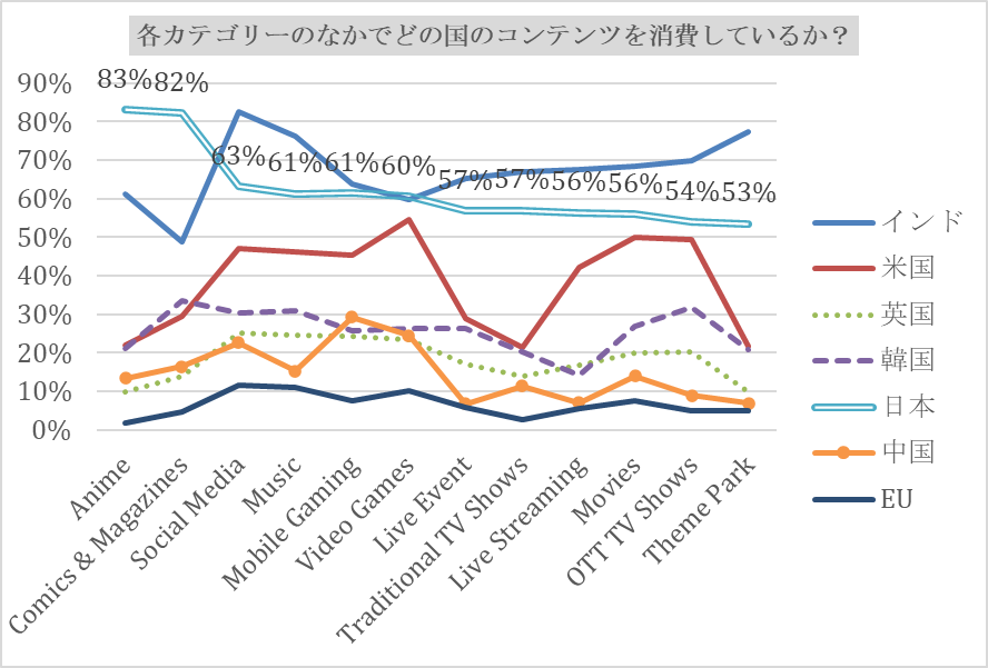需要の強さはこのNRIインドのデータにもあらわれている。MMAJにあえて来場しているファンだからということもあるが、8割は「アニメ」「コミック」を消費しており、インドの国産IPよりも、さらに米国IPよりもはるかに高い数字を示している。音楽・映画・SNS・テーマパークなどではさすがに国産が強いが、「海外系IP」のなかでは欧州・中国・アジアはもとより、ディズニーやワーナーなどの米国と比べてすら日本のアニメ・ゲームIPがダントツで需要されているという結果がでている。
