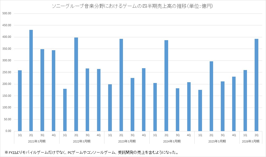 ソニーグループ<6758>は、この日(11月11日)、音楽分野におけるゲーム事業の第2四半期(25年7~9月)の売上高が前年同期比32.3%増の392億円だったことを明らかにした。対前年同期比プラスは4四半期連続となった。