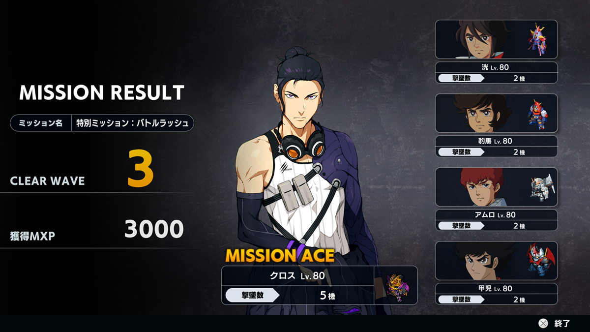 バトルラッシュに出現する敵の一団をWAVEと呼び、自軍フェイズ中に倒し切ればWAVEクリア。一定のWAVEをクリアすると初回のみ特別報酬として、強力な強化パーツやCREDITが入手できる。また、このミッションは何度も繰り返し遊べ、クリアしたWAVEに応じて大量のMXPの獲得が出来る。