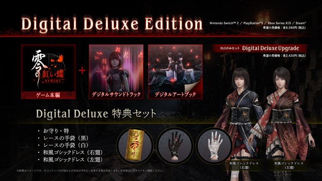 通常版に「オリジナルサウンドトラック」「デジタルアートブック」、さらにDigital Deluxe特典セットとして「お守り・特」「レースの手袋(黒/白)」、本作の世界観をデザインにあしらった「和風ゴシックドレス(右翅/左翅)」が付属する豪華版。また、「Digital Deluxe Edition」と同じ内容で、ゲームソフトが付属しない『零 ~紅い蝶~ RE MAKE Digital Deluxe Upgrade』も発売するので、好みに応じてお買い求めください。