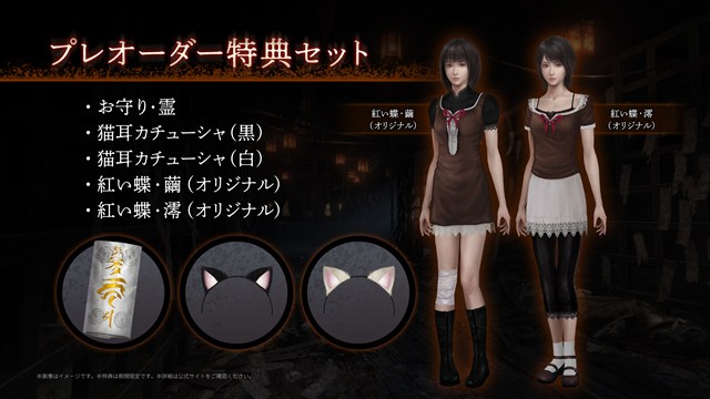 プレオーダー特典として、「お守り・霊」「猫耳カチューシャ(黒/白)」、さらにオリジナル版の衣装を再現した「紅い蝶・繭/澪」が付属する。プレオーダー特典を入手するには、発売日までに予約が完了している必要があるので、お早めにご予約ください。