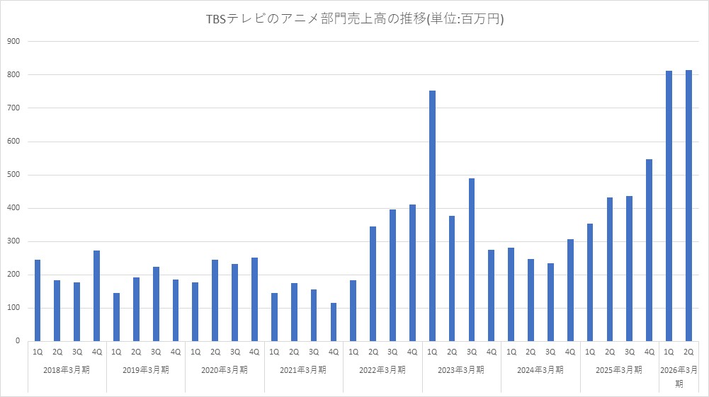 TBSホールディングス<9401>は、9月中間決算で、TBSテレビのアニメ部門の売上高が前の期比107.2%増の16億2800万円、粗利益が4億4200万円の損失計上(前年同期は7300万円の利益計上)と大幅増収・赤字転落となった。