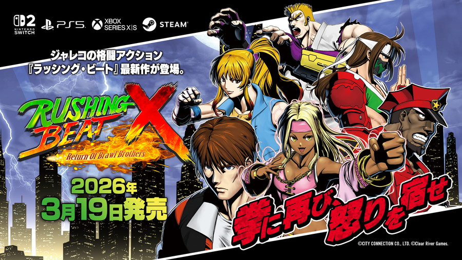 シティコネクションは、ジャレコの格闘アクション『ラッシング・ビート』シリーズ最新作『RUSHING BEAT X: Return Of Brawl Brothers』を、Nintendo Switch 2、PlayStation 5、Xbox Series XS、Steam向けに2026年3月19日に発売することを決定し、本日11月12日よりNintendo Switch 2(ゲームカード版)およびPlayStation 5のパッケージ版の予約を開始した。