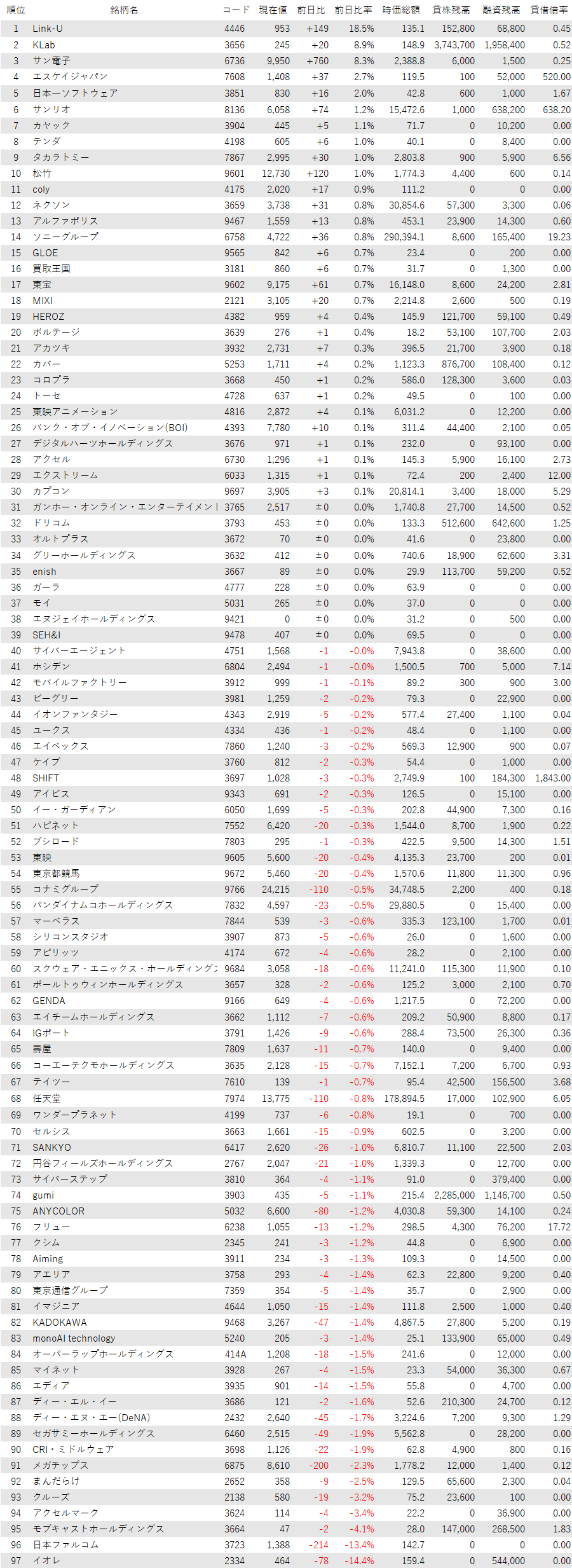 最後に騰落ランキングを見ると、Link-U<4446>が「クランチロールマンガ」への思惑からストップ高買い気配となった(関連記事)。KLab<3656>、サン電子<6736>、エスケイジャパン<7608>が値上がり率上位となり、イオレ<2334>、日本ファルコム<3723>、モブキャストHD<3664>、アクセルマーク<3624>が値下がり率上位となった。