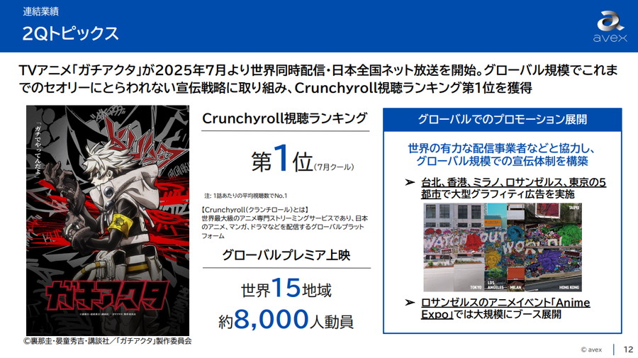 同社では、TVアニメ「ガチアクタ」が大ヒットしたようだ。Crunchyroll視聴ランキングで7月クール第1位を獲得した。グローバル規模でこれまでのセオリーにとらわれない宣伝戦略に取り組んだという。