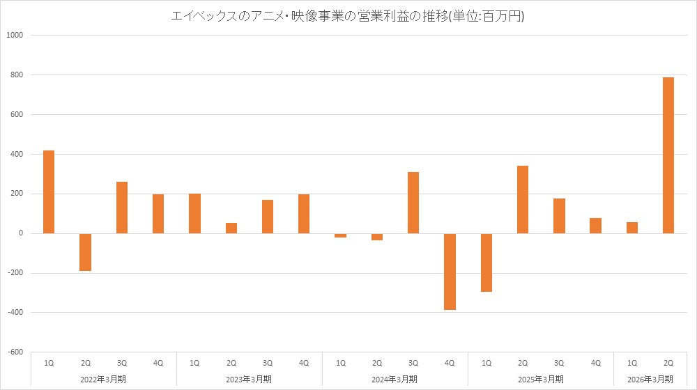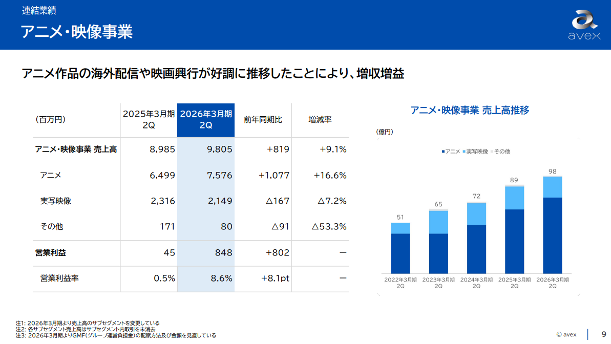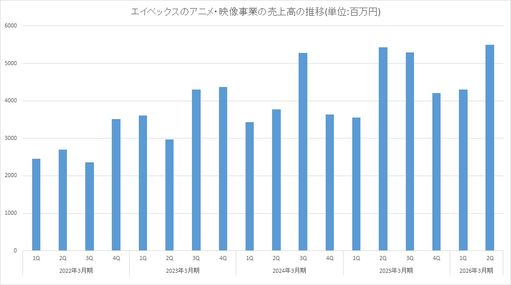エイベックス<7860>は、アニメ・映像事業の9月中間決算は、売上高が前年同期比9.1%増の98億0500万円、営業利益が同1784.4%増の8億4800万円と急拡大したことを明らかにした。同社では、アニメ作品の海外配信と映画興行が好調に推移したため、と説明している。