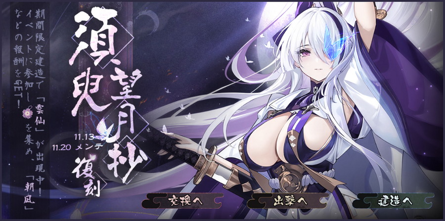 「須臾望月抄(復刻)」の開催に合わせ、UR「雲仙」、SSR「尾張」、SSR「初月」、SR「名取」が11月13日メンテナンス後から11月20日メンテナンスまで期間限定で建造に再登場する。「雲仙」は累計200回建造ごとに直接入手が可能である(最大4隻まで)。