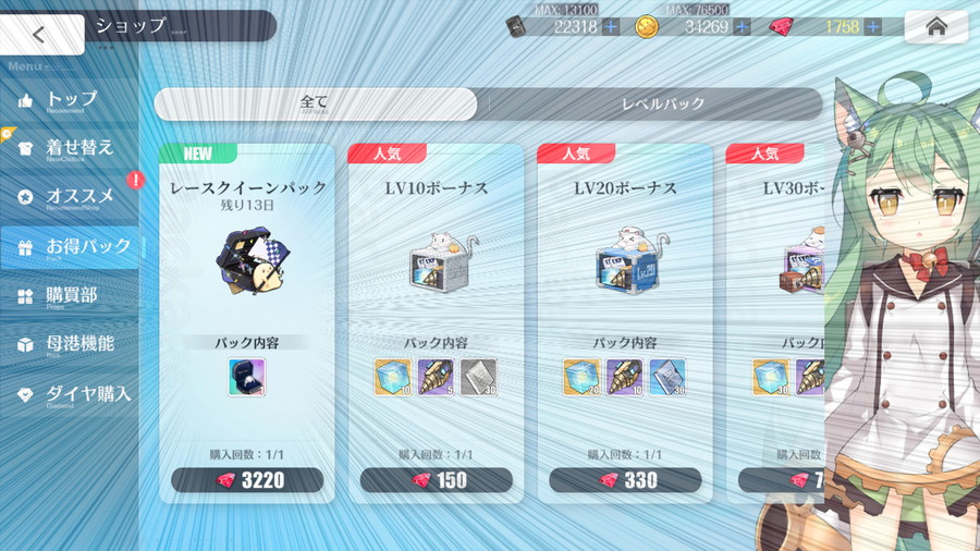 「燃料パック」(5回購入可能)、「建造パック」(1回購入可能)、「家具コインパック」(2回購入可能)、「メンタルユニットパック」(2回購入可能)が、11月13日メンテナンス後から11月19日23:59まで販売される。