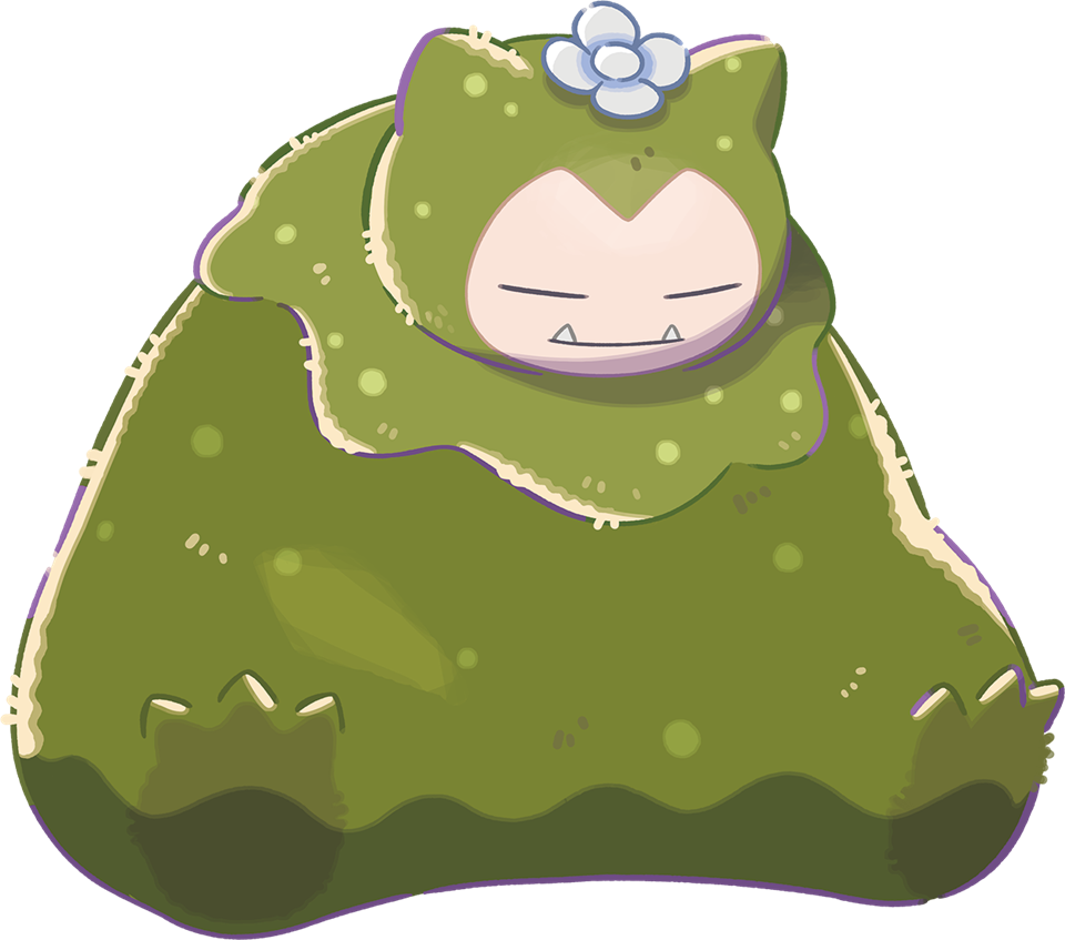 からだに苔が生え、頭の上にはお花が咲いているように見えるカビゴン。長い時間眠っていたみたい…?