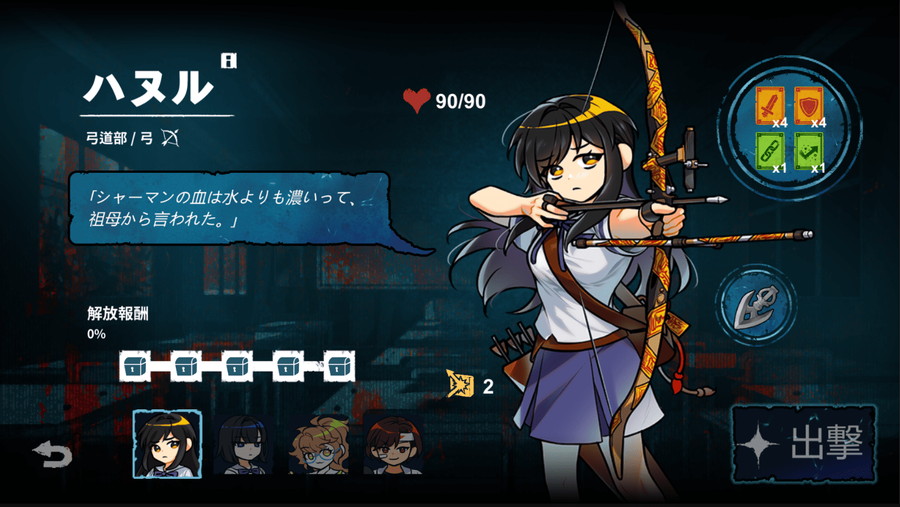 プレイアブルキャラクターは、ハヌル(弓道部)、スミ(剣道部)、アリン(化学部)、ミレ(陸上部)の4人がおり、それぞれ異なる武器と戦闘スタイルを持つため、戦略的なプレイが楽しめる。