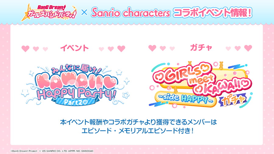 ブシロード<7803>は、『バンドリ! ガールズバンドパーティ!』(以下、『ガルパ』)にて、「バンドリ! ガールズバンドパーティ×サンリオキャラクターズ」コラボPart2を2025年11月20日15時から開催すると発表した。ログインプレゼントの期間は11月20日15時から11月30日14時59分までである。