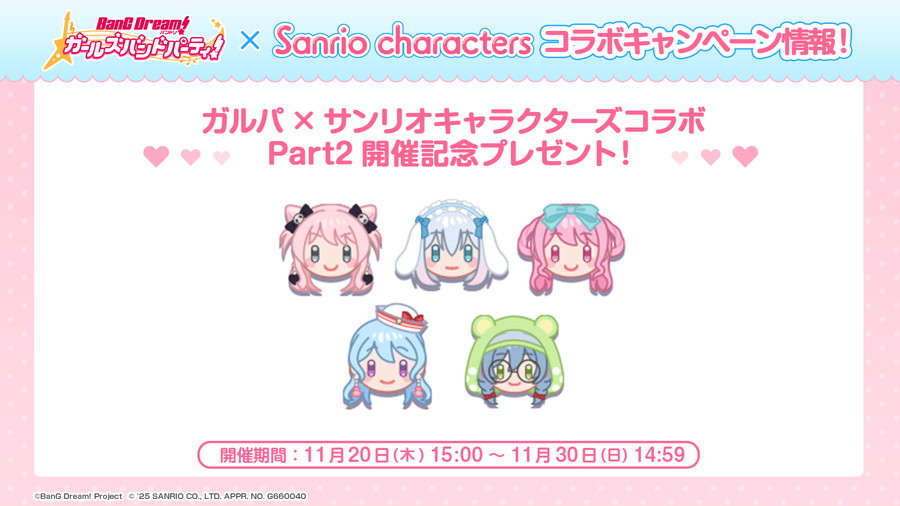 コラボPart2は11月20日15時から開催され、ガルパメンバーとサンリオのキャラクターたちが1キャラクターずつペアとなってコラボする。