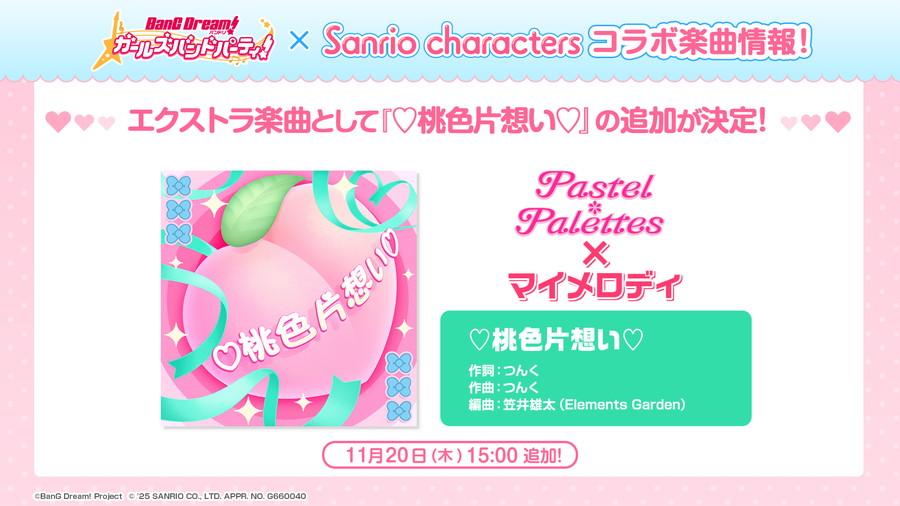 コラボを記念したエクストラ楽曲として、Pastel*Palettesとマイメロディの歌う『(ハート)桃色片想い(ハート)』が11月20日15時に追加される。作詞・作曲はつんく、編曲は笠井雄太(Elements Garden)である。同楽曲のMVは、YouTube「バンドリちゃんねる☆」にて11月20日20時よりプレミア公開される。