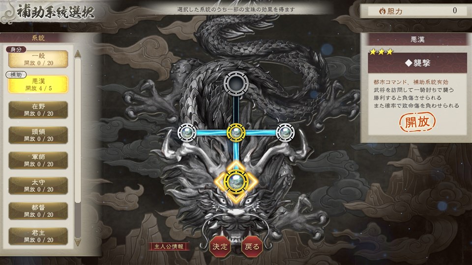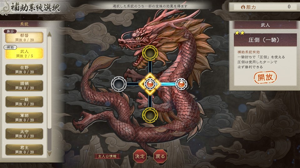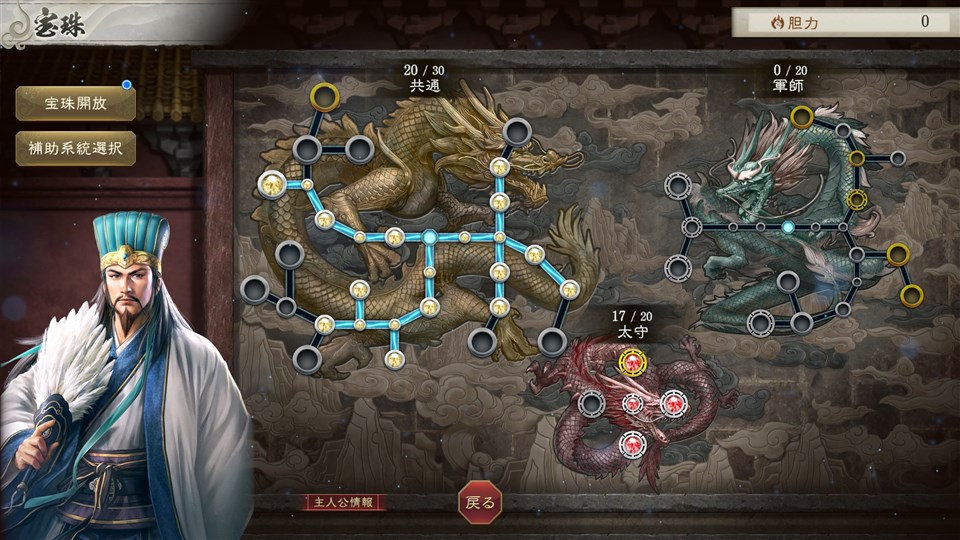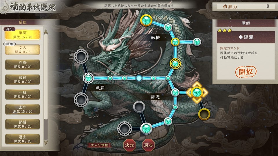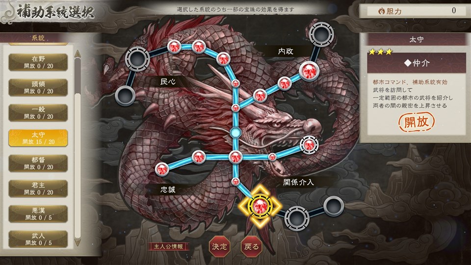 太守系統の「宝珠」には配下の忠誠を高めたり、民心を上げやすくしたりなど、自身の都市運営を便利にする宝珠が多く、なかでも部下同士の仲を深めることができる”仲介”は、活用することで内政にも戦闘にも大きな影響を与えることができる。また、「宝珠」には自由な系統をひとつだけセットできるようになる補助系統があり、太守の時に獲得した”仲介”は、別の身分になっても、補助系統に太守系統をセットすることで実行できる。自身の歩んだ道や経験が、できることの幅を広げる。