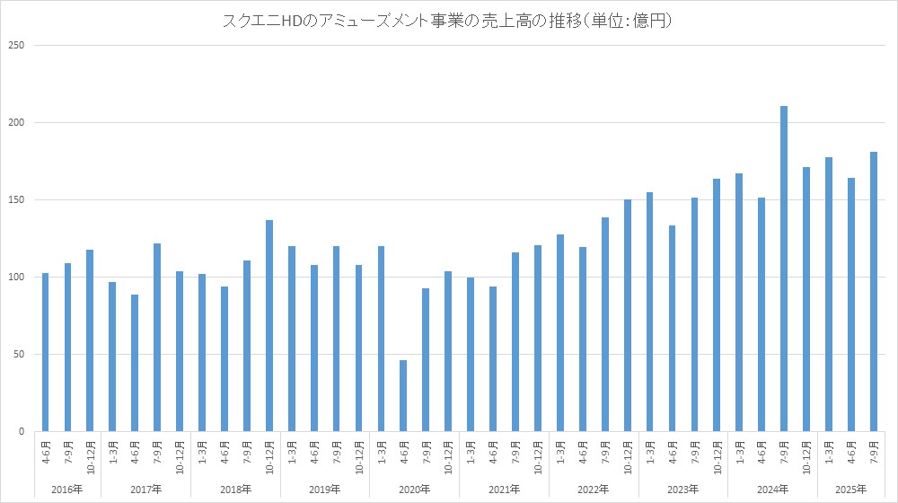 スクウェア・エニックス・ホールディングス<9684>は、2026年3月期 第2四半期(25年7~9月)のアミューズメント事業の業績について、売上高が前年同期比4.6%減の345億7800万円、営業利益が同0.3%減の42億1700万円と減収・微減益だった。