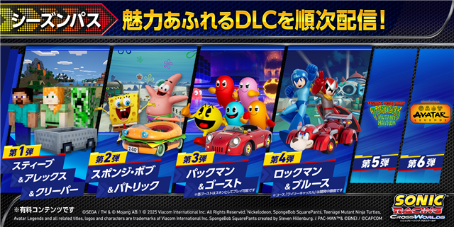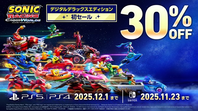 PlayStation5、PlayStation4、Nintendo Switch版『ソニックレーシング クロスワールド デジタルデラックスエディション』が、30%オフとなる初セールを開催中。デジタルデラックスエディションには、ゲーム本編に加え豪華コラボレーションDLCが含まれるシーズンパスがセットになっている。配信中のDLC第1弾「マインクラフト パック」はすぐにプレイできる。