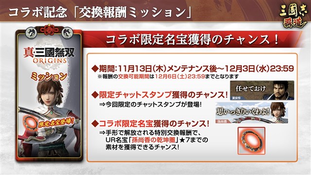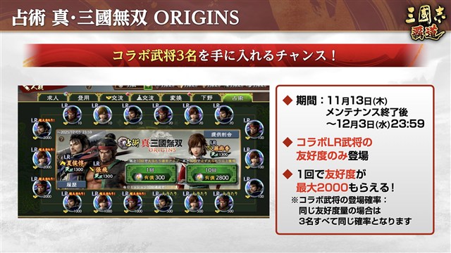 コーエーテクモゲームスは、『三國志 覇道』において、11月13日から『真・三國無双 ORIGINS』とのコラボレーションを12月3日までの期間限定で開始した。