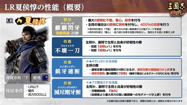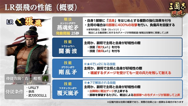 LR 張飛は、高い耐久性を持ち、敵から攻撃を受けるたび/敵を撃破するたびに強くなる、攻守一体の歩兵武将。LR 孫尚香は、通常攻撃で会心威力を強化/会心攻撃で戦法攻撃威力を強化する、強力なコンボ効果を携えた弓兵武将。LR 夏侯惇は、強力な通常攻撃に加え、戦法で最大6部隊に強化効果を与えることができる騎兵武将。さらに、LR 張飛・LR 孫尚香・LR 夏侯惇はいずれも、被ダメージを一定まで軽減し、条件を満たせば全ての不利変化や戦法遅延などを無効化することができる技能「外功」を所持している。