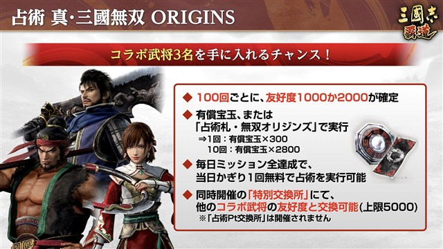 『真・三國無双 ORIGINS』コラボでは、LR 張飛、LR 孫尚香、LR 夏侯惇の3名が武将として『三國志 覇道』に登場。3名は専用の「占術 真・三國無双 ORIGINS」から手に入れることができる。