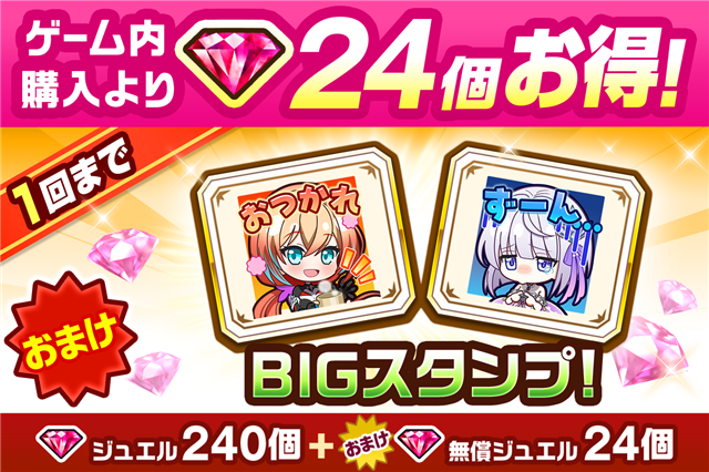内容物:「ジュエル」240個、「無償ジュエル」24個、「BIGスタンプ」3個、「EXルーン」2個