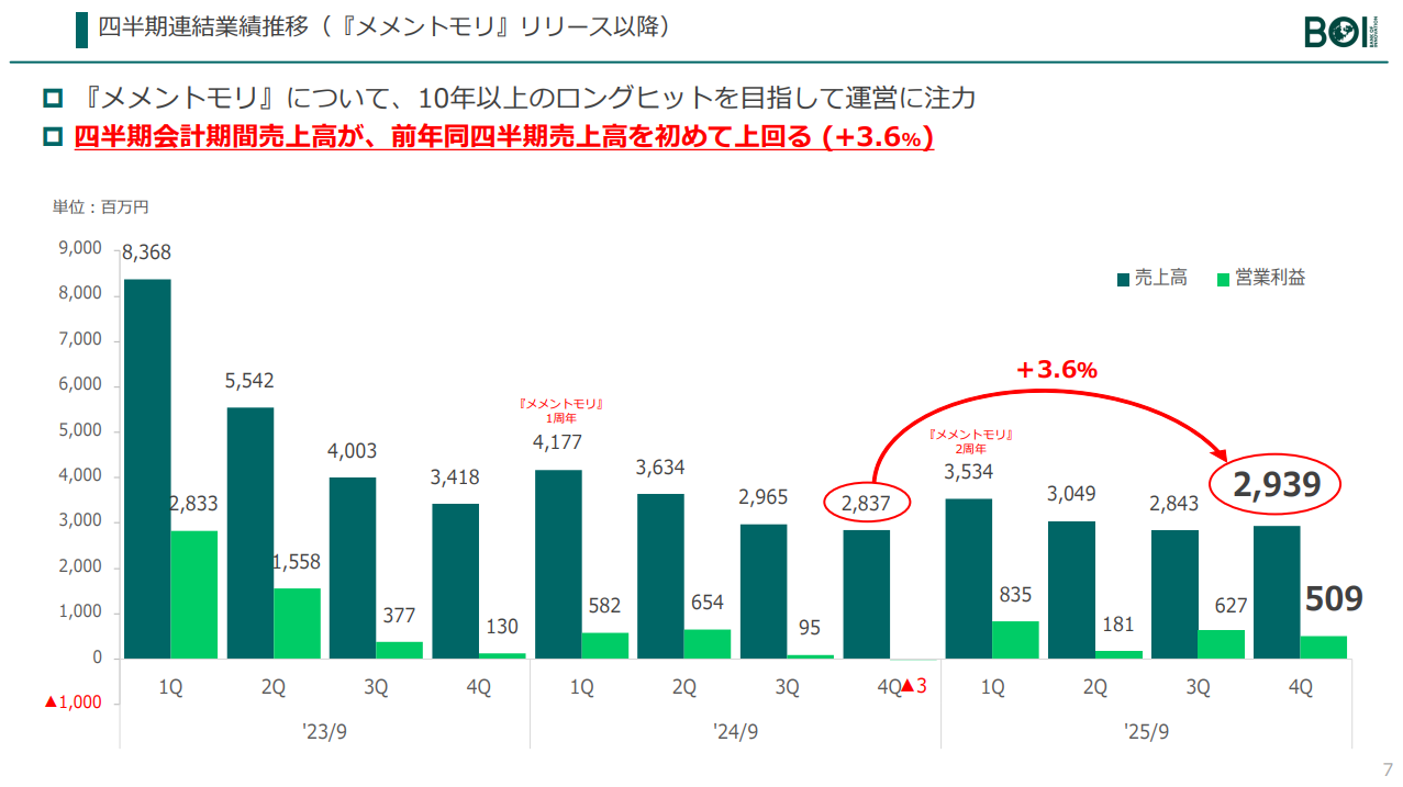 バンク・オブ・イノベーション(BOI)<4393>は、この日(11月14日)、第4四半期(25年7~9月)の売上高が前年同期比3.6%増の29億3900万円となり、『メメントモリ』リリース以来初の前年同期比プラスに転じたことを明らかにした。ゲームアプリは経年で売上が低下していくのが一般的で、非常に珍しいケースと言えよう。