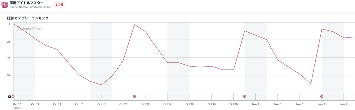 『学マス』は「復刻!仮装狂騒曲 手毬&広ガシャ」や「仮装狂騒曲 復刻! アナザーアイドル'25 ハロウィンガシャ」、「SSR確定セレクトガシャ」と各種施策を展開しており、70位から一気に上位へと駆け上がった。