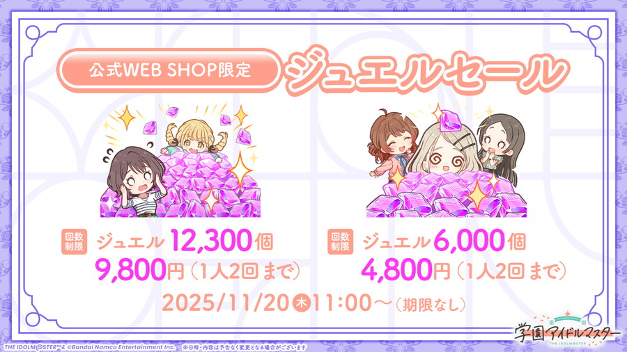ジュエルをお得に購入できる「学園アイドルマスター公式WEB SHOP」が2025年11月20日にオープン決定。公式WEB SHOP限定のジュエルセールが開催される。(セール期間は無期限)