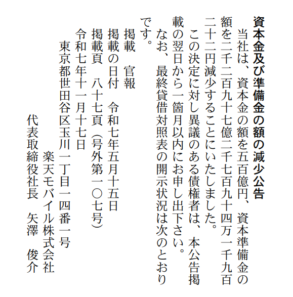 楽天モバイルが減資を行うことがわかった。11月17日付の「官報」に掲載された「資本金及び準備金の額の減少公告」によると、資本金を500億円、資本準備金を2297億円減らすとのこと。