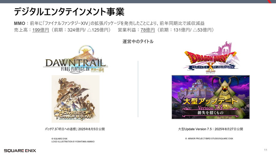 MMO(大規模多人数同時参加型オンライン)ゲームは、売上高が38.5%減の199億円、営業利益が同40.4%減の78億円と大幅減収減益だった。前年同期に『ファイナルファンタジーXIV』拡張パックを発売していたため、その反動減となる。定期的にMMOの拡張パックを発売し、売上と利益を大きく伸ばすものの、翌年に反動減で売上、利益を減らすことが度々あった。