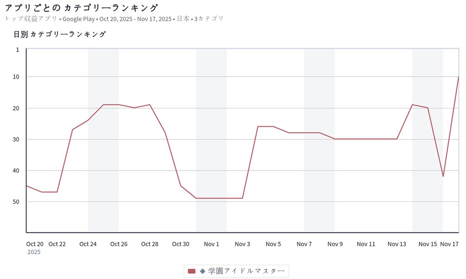 また、バンダイナムコエンターテインメントの『学園アイドルマスター』が前日の42位から10位に急上昇してきた。『学マス』は、11月16日11時より、新プロデュースアイドル